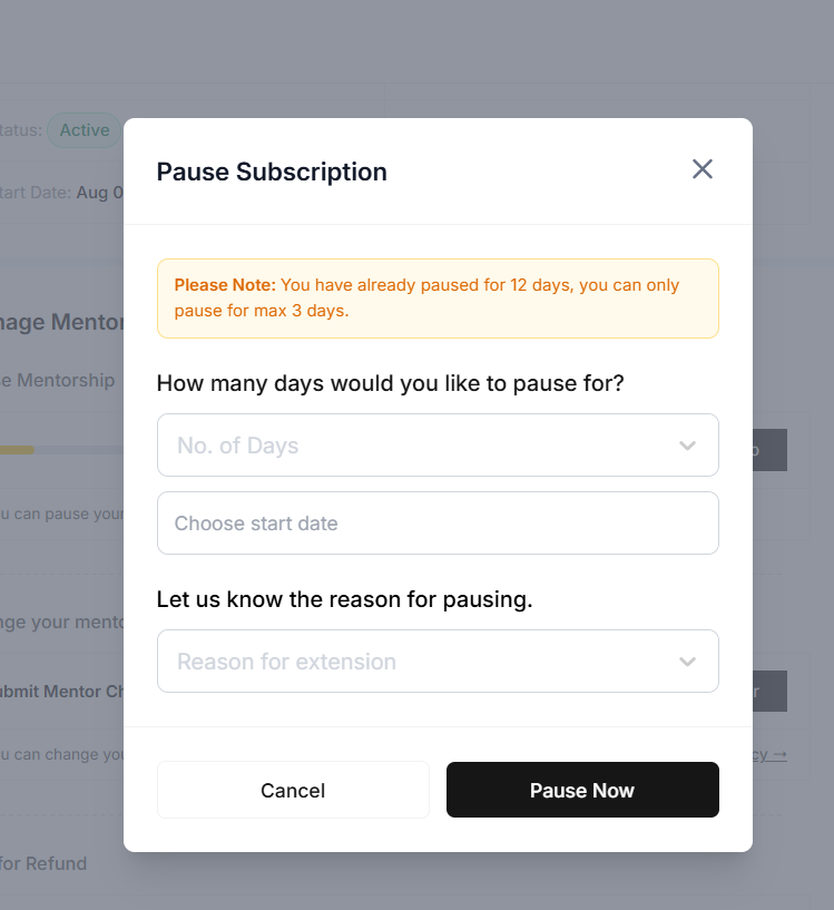 i paused my mentorship for only 5 days but its showing 12 days. kindly resolve the issue