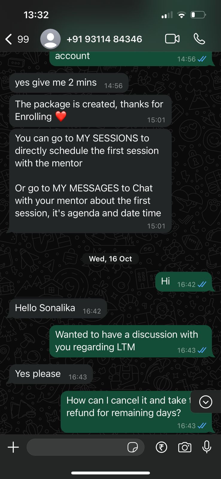 need refund in bank account, not liking the mentorship platform. Have connected with concerned person on 16th October.