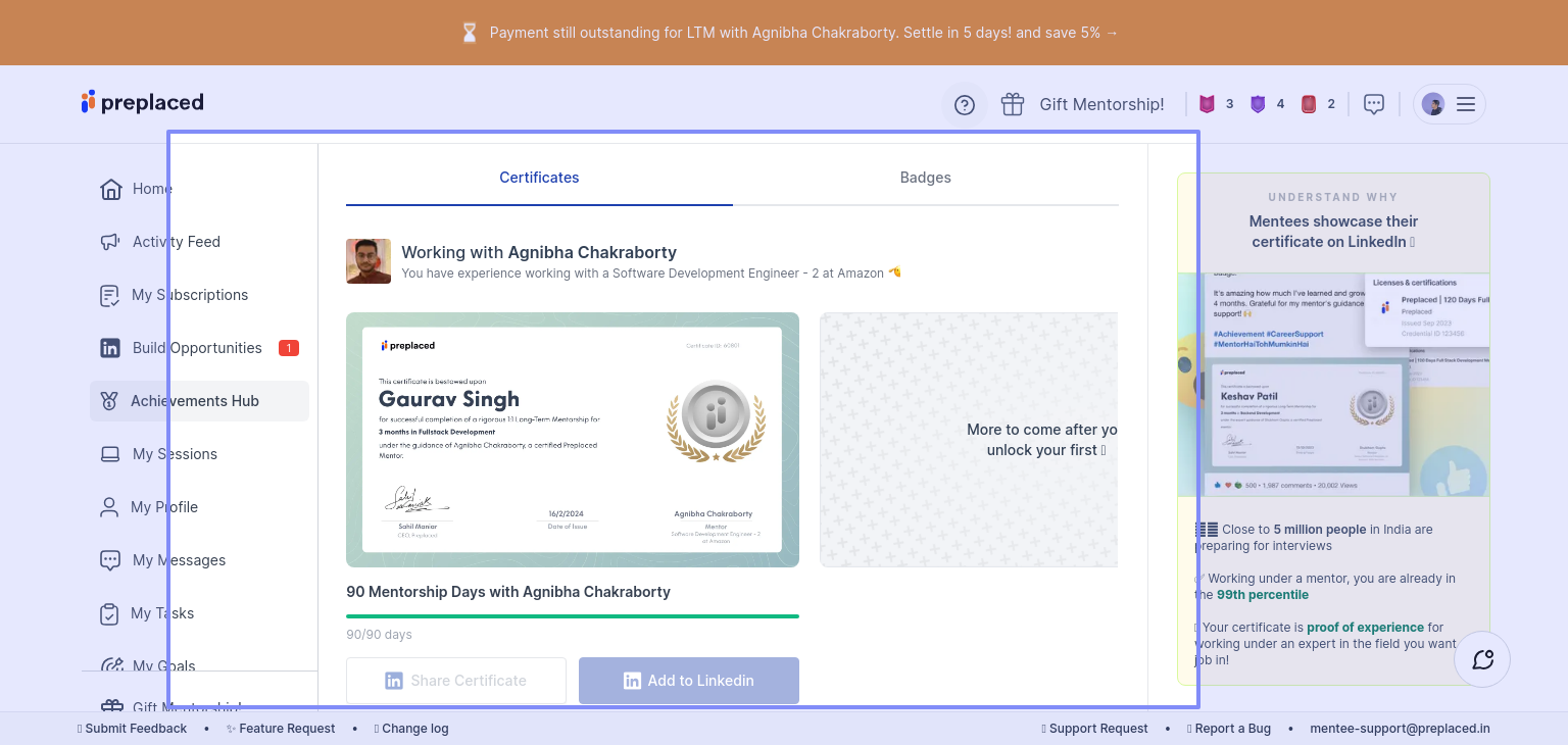 I have completed 3 months with my mentor and still it is showing that certificate is unlocked. I have raised this issue previously also but no one resolution has been provided. Please help me with this ASAP!!