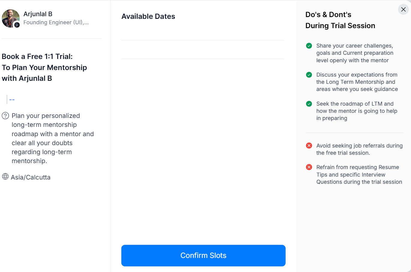 Not able to book a trial session with mentor Arjunlal. Available slots are not loading.