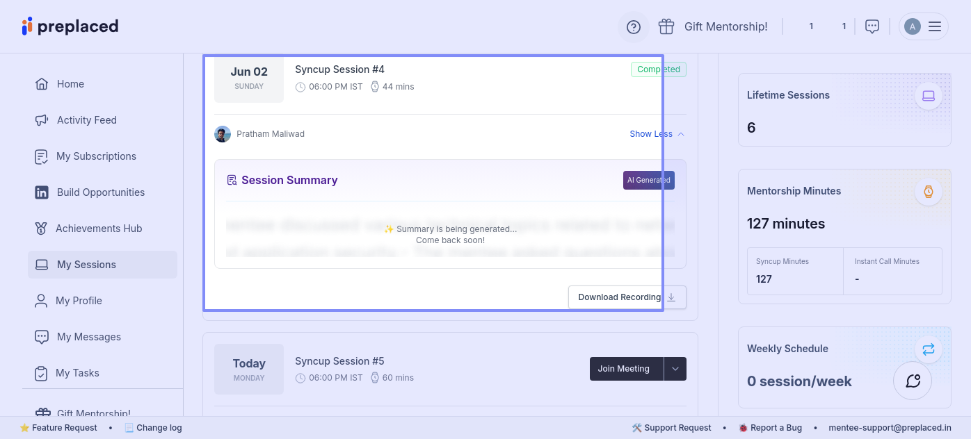 I have done today session with my mentor Pratham.However I am getting error message once I go for download my recording