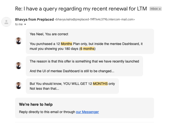 I have booked for a year plan and only after 6 months the subscription is showing as completed. Last time when I checked with support team I was told I have a year plan but it does not show any active subscription on Dashboard. please find below the screenshot of the conversation for the mentioned issue.