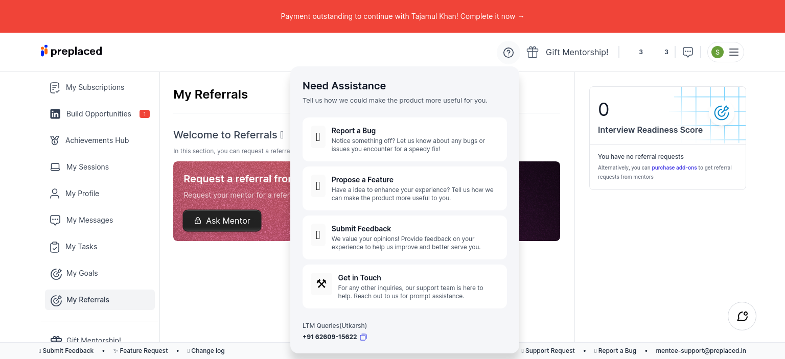 I have not received any assistance regarding this. My package was of 4 months and it was mentioned in the package that I will get assistance with referrals. Please help me in this regard. I need more clarification. Also my referrals section is locked showing my interview readiness score as 0. My package got over last month.
