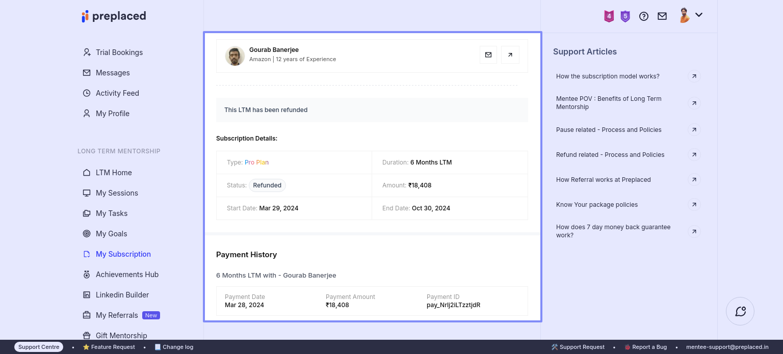 I recently discovered an issue with my Pro Plan mentorship subscription with Gourab Banerjee, which began on March 29, 2024, as a 6+6 month plan. My subscription status is now unexpectedly marked as "Refunded" with an end date of October 30, 2024, though I did not request any refund. This status is preventing my mentor from scheduling further sessions.